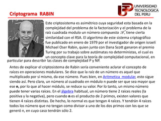 Este documento describe varios criptosistemas clásicos asimétricos como Rabin y Merkle-Hellman. Explica el funcionamiento del criptosistema de Rabin basado en el problema de calcular raíces cuadradas módulo un número compuesto y cómo implementarlo. También cubre el problema matemático de la mochila y cómo puede usarse una "mochila simple" para cifrar información de forma que el descifrado sea único.