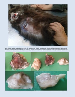 Este documento presenta el caso de una gata llamada Duddy que presentaba numerosos nodulos cutáneos avanzados causados por criptococosis. A pesar del tratamiento con antibióticos y corticoesteroides, los nodulos continuaron creciendo. El examen histopatológico requirió tinción especial para diagnosticar criptococosis. Dado el estado grave del animal, se recomendó la eutanasia. La autopsia reveló diseminación del hongo a los pulmones y riñones, indicando una infección sistémica.