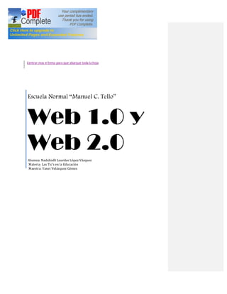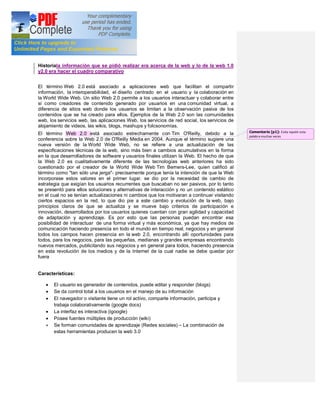 El documento proporciona una explicación de la Web 1.0, Web 2.0 y las diferencias entre ellas. La Web 1.0 se centra en contenido estático creado por pocos, mientras que la Web 2.0 fomenta la participación y colaboración de los usuarios para crear y compartir contenido dinámico de manera continua. El documento también lista ejemplos de aplicaciones Web 2.0 como redes sociales y herramientas de colaboración, y discute algunas ventajas y desventajas de cada versión de la web.