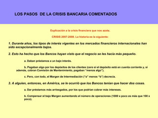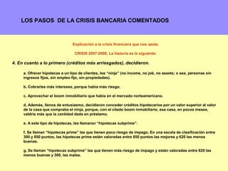 1) Los bancos estadounidenses empezaron a dar préstamos hipotecarios arriesgados, llamados "subprime", a personas con pocos ingresos para aumentar sus ganancias. 2) Estos préstamos se empaquetaron en productos financieros llamados MBS que los bancos vendieron rápidamente para cumplir con regulaciones. 3) Cuando la burbuja inmobiliaria estalló, muchos deudores no pudieron pagar y la crisis financiera global comenzó.