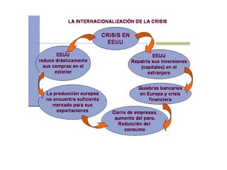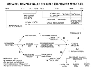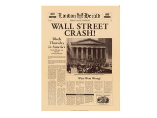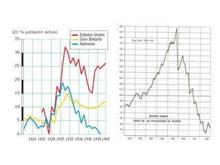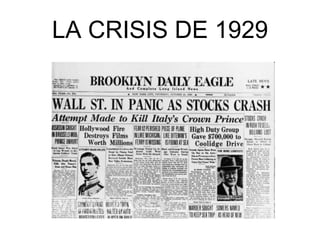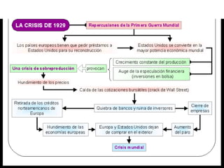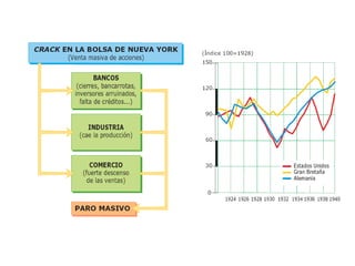 El documento describe la crisis económica de 1929, incluyendo sus causas y consecuencias. La crisis comenzó con el Crack de la Bolsa de Nueva York en 1929, debido a la sobreproducción, la especulación excesiva y los préstamos demasiado arriesgados. Esto llevó a una depresión económica mundial que duró casi 10 años, con consecuencias como el aumento del desempleo, la caída de los niveles de vida y el fortalecimiento de ideologías extremas como el comunismo y el fascismo.