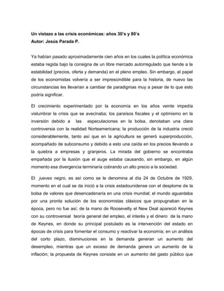 Este documento resume dos crisis económicas importantes, la de los años 30 y la de los años 80. La Gran Depresión de los años 30 llevó al surgimiento de la teoría keynesiana, la cual proponía la intervención del estado para estimular el consumo y la inversión durante las recesiones. La crisis de los años 80 dio lugar al surgimiento del monetarismo de Friedman, que favorecía la desregulación y la reducción del gasto público. Ambas crisis requirieron nuevos enfoques económicos para resolver problemas como el desempleo y la qu