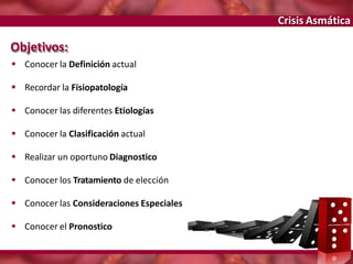 Este documento describe la crisis asmática, definiéndola como un episodio agudo o subagudo que se caracteriza por un aumento progresivo de síntomas como disnea, tos, sibilancias y opresión torácica, junto con una disminución de los flujos espiratorios. Explica la fisiopatología, etiología, diagnóstico y tratamiento de la crisis asmática, señalando que el objetivo es reconocer oportunamente la gravedad de la obstrucción y tratarla de manera adecuada para mejorar