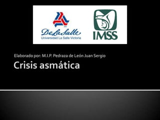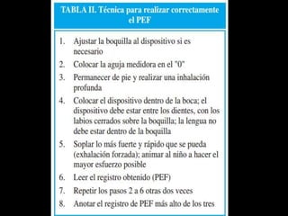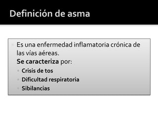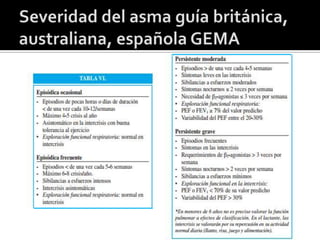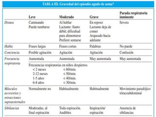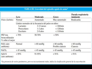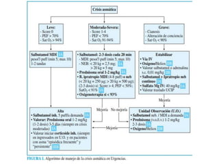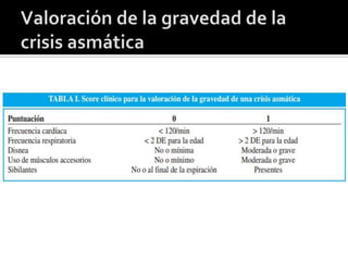 El documento aborda el asma como una enfermedad inflamatoria crónica de las vías aéreas, común en la infancia, con síntomas como tos, dificultad respiratoria y sibilancias. Se detallan factores de riesgo, métodos de valoración de la gravedad de las crisis asmáticas y opciones de tratamiento, incluyendo broncodilatadores y corticoides sistémicos. Se destaca la importancia de la espirometría y el manejo adecuado para reducir recaídas y obtener una broncodilatación eficaz.