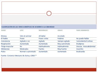 El documento describe el asma como una enfermedad inflamatoria crónica que causa dificultad respiratoria, caracterizada por crisis de tos y sibilancias. Destaca la importancia de un diagnóstico adecuado y un manejo urgente estructurado para los episodios asmáticos, incluyendo tratamiento con broncodilatadores y corticoides. Además, menciona factores predisponentes, desencadenantes y recomendaciones para el manejo integral del asma.
