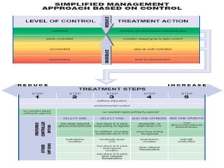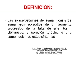 Las exacerbaciones de asma (crisis de asma) son episodios de aumento progresivo de falta de aire, tos, sibilancias u opresión torácica. El documento proporciona recomendaciones para la evaluación y tratamiento de crisis asmáticas basadas en la Iniciativa Global para el Manejo y Prevención del Asma. Las crisis graves ponen en peligro la vida y requieren supervisión cercana y tratamiento inmediato con broncodilatadores, corticoides y oxígeno.