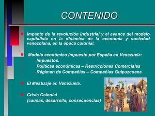 El documento describe el impacto de la Revolución Industrial y el avance del modelo capitalista en la economía y sociedad venezolana durante la época colonial. Explica cómo el modelo económico impuesto por España se basaba en impuestos, restricciones comerciales y compañías monopólicas. También analiza el mestizaje y las causas y desarrollo de la crisis colonial que llevó a la independencia.