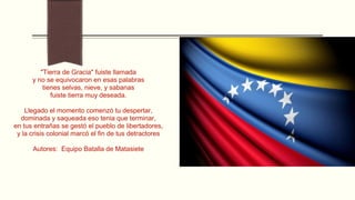 El documento presenta información sobre la crisis colonial en Venezuela. Brevemente describe las causas, el desarrollo y las consecuencias de la crisis colonial, así como el impacto de la Revolución Industrial y el modelo económico impuesto por España durante el periodo colonial, incluyendo impuestos y la Compañía Guipuzcoana. El equipo "Batalla de Matasiete" preparó el documento como parte de un curso sobre la historia socioeconómica de Venezuela.