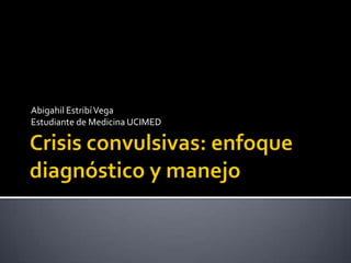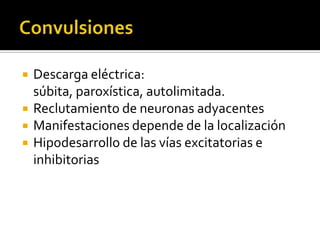 Este documento resume los diferentes tipos de convulsiones, incluyendo las parciales, generalizadas, febriles y neonatales. Describe las manifestaciones clínicas dependiendo de la localización en el cerebro y el estado de conciencia del paciente. También cubre el tratamiento de emergencia para las convulsiones, incluyendo el uso de benzodiacepinas como diazepam, lorazepam y midazolam para detener las crisis activas, así como antiepilépticos como fenobarbital y difenilhidantoina para prevenir recurren