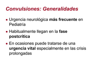 Este documento proporciona información sobre convulsiones en pediatría. Explica que las convulsiones son una urgencia neurológica frecuente, generalmente llegan en la fase postcrítica y a veces pueden ser una urgencia vital. Las causas varían según la edad y las convulsiones febriles son las más comunes. Detalla la clasificación, diagnóstico, evaluación y tratamiento de las convulsiones incluyendo el estado de mal, con énfasis en la estabilización, medicamentos como diazepam, fenitoína y