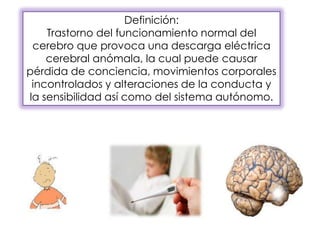 Este documento define la epilepsia como un trastorno cerebral que causa descargas eléctricas anormales en el cerebro y puede provocar pérdida de conciencia y movimientos involuntarios. Describe las posibles causas de la epilepsia y los dos principales tipos: convulsiones generalizadas y parciales. También resume los síntomas, tratamientos como medicamentos y cirugía, y las intervenciones de enfermería para la seguridad y educación del paciente y la familia.