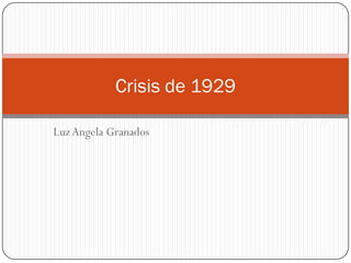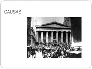 La crisis de 1929 se debió a la sobreproducción y a la desigual recuperación económica entre países. Esto llevó al hundimiento de la bolsa y la quiebra de empresas y bancos, generando un aumento del desempleo y problemas sociales. Los países adoptaron medidas proteccionistas y devaluaron sus monedas para solucionar la crisis de forma individual, sin cooperación internacional. Estados Unidos implementó el New Deal con inversiones estatales para crear empleos, estimular el consumo y reactivar la economía.