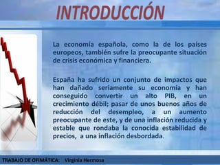 La crisis económica comenzó en Estados Unidos y se expandió a nivel mundial. Afectó negativamente a los países europeos como España, donde aumentó el desempleo, la inflación y disminuyó el crecimiento del PIB. La crisis se originó por la burbuja inmobiliaria en España y Estados Unidos, el ajuste en la construcción, la restricción del crédito y el aumento de los precios de la energía y las materias primas.
