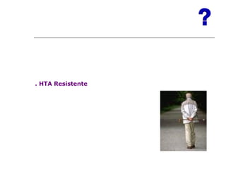 El documento trata sobre la hipertensión arterial resistente y las crisis hipertensivas. La HTA resistente se define como una presión arterial ≥140/90 a pesar de tres fármacos antihipertensivos a dosis plena, incluyendo un diurético. Las causas de la HTA resistente incluyen baja adherencia al tratamiento, estilos de vida no saludables, consumo de drogas y causas secundarias no reconocidas. Las crisis hipertensivas se clasifican como urgencias o emergencias hipertensivas dependiendo de la presencia