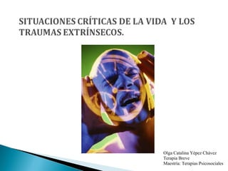 El documento discute varios tipos de crisis psicológicas como el divorcio, la pérdida de empleo, la enfermedad y la muerte de un ser querido, la violencia y el embarazo no deseado. Explica que cada individuo experimenta las crisis de manera única dependiendo de sus antecedentes biopsicosociales. También describe los enfoques de la terapia breve para ayudar a las personas a enfrentar y superar diferentes tipos de crisis.
