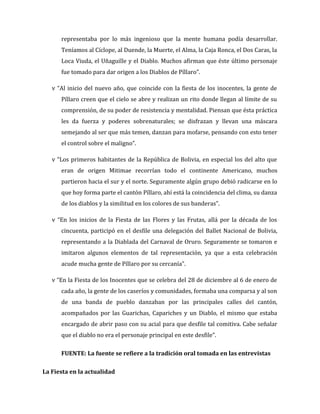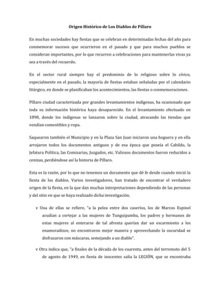 El documento describe el origen y la historia de la tradición de Los Diablos de Píllaro en Ecuador. Existen varias teorías sobre el origen de la fiesta, que conmemora eventos pasados para mantener vivas las tradiciones. Actualmente, la celebración atrae a personas de diferentes comunidades y parroquias rurales y dura varios días, con bailes, disfraces coloridos de diablos y música.