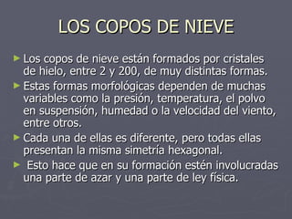 Cada año caen alrededor de 1 cuatrillón de copos de nieve en la Tierra durante las nevadas. Los copos de nieve están formados por cristales de hielo con formas muy variadas que dependen de factores como la temperatura, la humedad y el viento. Aunque cada copo es único, todos presentan simetría hexagonal debido a las leyes físicas que rigen su formación.