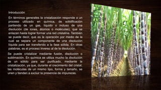 El documento describe el proceso de cristalización de azúcar a partir de jugo de caña de azúcar. La cristalización ocurre en tachos que contienen jugo de caña sobresaturado donde se siembran pequeños cristales de azúcar para que crezcan. El proceso incluye etapas como la carga del jugo, concentración, siembra, crecimiento y descarga de la masa cocida de azúcar cristalizado y miel madre. También se describen diferentes tipos de equipos de cristalización como cr