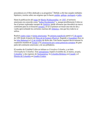 Cristóbal Colón (c. 1436-1506) fue un navegante y cartógrafo genovés que realizó cuatro viajes a las Américas y descubrió el continente para Europa en 1492. Aunque su lugar de nacimiento es incierto, la teoría más apoyada es que nació en Génova. Colón trabajó para la Corona de Castilla y sus viajes impulsaron la colonización europea de América.