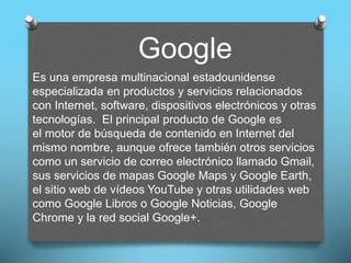 Este documento proporciona información sobre varios productos y servicios de Google, incluyendo su buscador principal, Gmail, Google Maps, YouTube, Android y más. También describe algunas de las características y funcionalidades clave de estos servicios, como la capacidad de almacenamiento en Gmail, las funciones de búsqueda avanzada, y la interfaz basada en AJAX. Por último, menciona algunas de las críticas que ha recibido Google, especialmente en relación con la privacidad de los datos y la colaboración con agencias de int