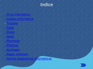 El documento describe diferentes tipos de malware informático, incluyendo virus, gusanos, troyanos, espías, dialers, spam, pharming, phishing, keyloggers, software falso y nuevos dispositivos informáticos. Los virus se replican a sí mismos infectando otros archivos, los gusanos se replican en redes, los troyanos ocultan software dañino, y el espionaje, phishing y keyloggers recopilan información privada sin consentimiento.