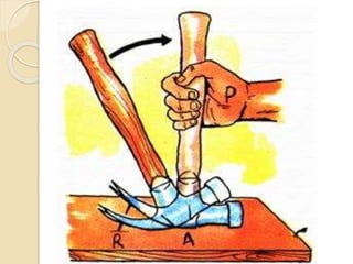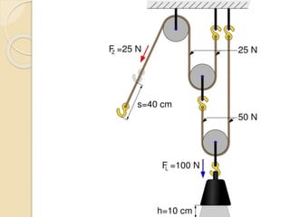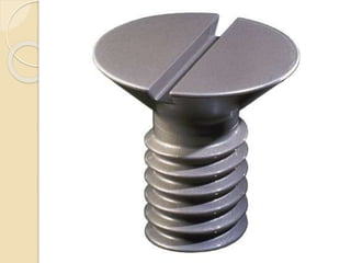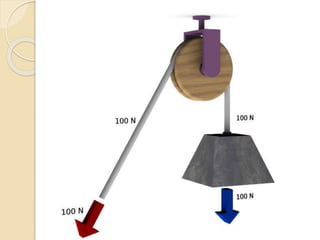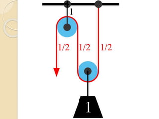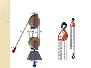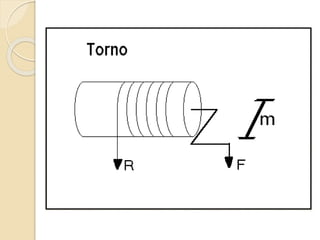 Este documento resume las principales máquinas simples, incluyendo la palanca, la polea, el polipasto, la rueda, el torno, el tornillo, la cuña y el plano inclinado. Explica cómo cada máquina simple funciona para reducir la fuerza necesaria mediante el aumento de la distancia de aplicación de la fuerza o cambiando la dirección de la fuerza. Concluye que las máquinas simples han sido cruciales para la ingeniería desde su descubrimiento al permitir disminuir el peso de objetos y reducir el esf