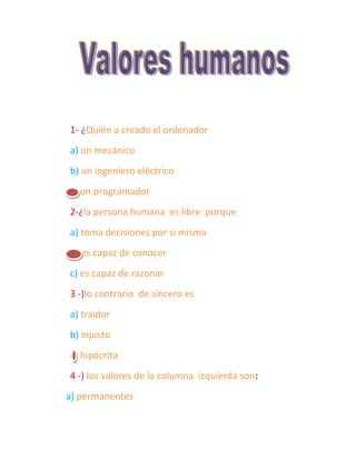 El documento presenta 10 preguntas de opción múltiple sobre temas como la creación del ordenador, la naturaleza humana, valores, virtudes y más. Las respuestas correctas son: b) un ingeniero eléctrico creó el ordenador; a) los seres humanos son libres porque toman sus propias decisiones; c) lo contrario de sincero es hipócrita; a) los valores de la izquierda son permanentes; b) lo que justifica el esfuerzo es llevar tu personalidad a plenitud; a) el ordenador puede perfe