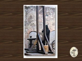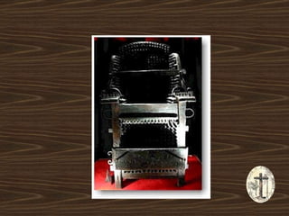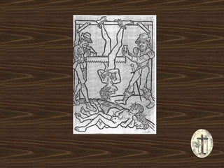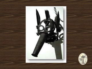La Inquisición fue establecida formalmente en 1231 por el papa Gregorio IX para localizar, procesar y sentenciar a personas culpables de herejía, con penas que incluían la excomunión. Los inquisidores tenían amplios poderes y podían utilizar varios instrumentos de tortura como el collar de puas, la ablación de pies y manos con fuego, y el aplastacabezas para extraer confesiones. Estas herramientas causaban un dolor intenso y a menudo conducían a la muerte de la víctima.