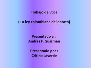 El documento presenta los argumentos legales y éticos a favor de despenalizar el aborto en Colombia en circunstancias extremas como cuando peligra la vida o salud de la mujer, existe una malformación fetal grave o el embarazo es producto de una violación. Entre los argumentos se encuentran que la penalización total del aborto constituye un problema de salud pública, es discriminatorio hacia las mujeres, afecta desproporcionadamente a las mujeres de bajos recursos, y que la decisión de abortar está relacionada con la autonomía y libertad individual. A