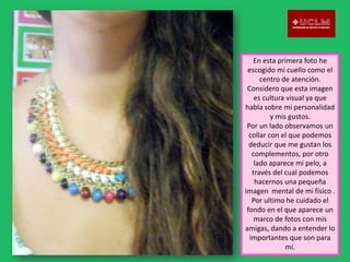 Este documento presenta 5 fotos que la autora considera ejemplos de cultura visual. La primera foto muestra su collar y pelo, revelando sus gustos por los complementos y su apariencia física. La segunda foto enfoca su pelo, una parte llamativa de su físico. La tercera foto presenta sus pies, que pueden revelar detalles sobre la persona. La cuarta foto incluye sus pulseras y anillo, regalos de personas cercanas. La quinta y última foto captura el paisaje desde su ventana, mostrando un r