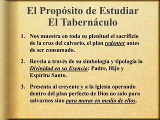 El documento describe los diferentes elementos del Tabernáculo y su significado tipológico, mostrando cómo apuntan a Cristo. Explica los muebles del Tabernáculo como el Arca del Pacto, el Propiciatorio, la Mesa de los Panes y el Candelero, y cómo cada uno representa un aspecto de Cristo. También describe las vestiduras del Sumo Sacerdote y su significado, resaltando que todo apunta a la persona y obra de Cristo.