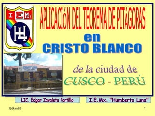 La estatua del Cristo Blanco en Cusco, Perú mide aproximadamente 8 metros de altura. Fue construida en 1945 e inaugurada en el mirador de la ciudad, donde ofrece una vista espectacular. El documento aplica el Teorema de Pitágoras para calcular la altura de la estatua a partir de las medidas dadas.