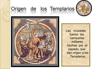 Los templarios surgieron de las Cruzadas, campañas militares del papado para recuperar la Tierra Santa, especialmente Jerusalén. Fundados en 1118 por líderes como Hugo de Payns, recibieron el control del Templo de Salomón. Se les asoció con diversas acusaciones en la Edad Media, incluyendo sodomía y la quema de sus miembros en Francia.