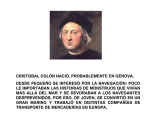 Cristóbal Colón nació en Génova y desde joven se interesó por la navegación. Creía que la Tierra era redonda y quería demostrar que se podía llegar a la India navegando hacia el oeste. Buscó apoyo de los Reyes de España, Isabel y Fernando, para financiar su expedición a pesar de la oposición inicial. Zarpó en 1492 con tres carabelas y 90 hombres y después de un largo viaje llegó a una isla en América, aunque pensaba haber llegado a la India.