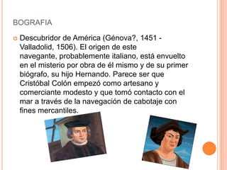 Cristóbal Colón fue un navegante italiano que descubrió América para España en 1492. Navegó a través del Océano Atlántico y llegó a las Bahamas, Cuba y La Española. A su regreso a España, Colón fue recibido por los Reyes Católicos. Realizó tres viajes más a las Américas entre 1493 y 1504, explorando más territorios. Colón murió en Valladolid en 1506, dejando un testamento en el que nombró a su hijo Diego como heredero de