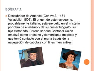 Cristóbal Colón fue un navegante italiano que descubrió América para España en 1492. Navegó a través del Océano Atlántico y llegó a las Bahamas, Cuba y La Española. Más tarde realizó tres viajes más para explorar las nuevas tierras. Un día antes de su muerte en 1506, Colón redactó su testamento nombrando a su hijo Diego como heredero principal de sus títulos y propiedades.