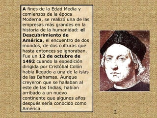 Cristóbal Colón realizó cuatro viajes al Nuevo Mundo entre 1492 y 1504, descubriendo las Américas para Europa. En su primer viaje en 1492, llegó a una isla de las Bahamas creyendo haber llegado a Asia, inaugurando el encuentro entre los mundos europeo y americano. Sus viajes posteriores exploraron más regiones del Caribe y América del Sur, aunque nunca supo que había encontrado un nuevo continente y no Asia.