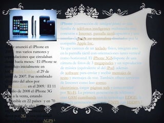 El iPad es un dispositivo tipo tableta desarrollado por Apple con una pantalla táctil de 9.7 pulgadas, sistema operativo iOS y capacidades como navegación web, lectura de libros y reproducción de video. Funciona a través de una interfaz diseñada para aprovechar su tamaño de pantalla y permitir el acceso a actividades de entretenimiento. Existe en modelos Wi-Fi y Wi-Fi con conectividad 3G.