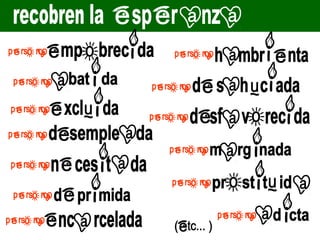 El documento habla sobre la esperanza y la necesidad de promoverla. Menciona que la esperanza se fundamenta en la participación, la solidaridad y compartir con los demás. También destaca historias de personas y organizaciones que trabajan para crear esperanza en los demás a través de la ayuda y el compromiso comunitario con el objetivo de construir un mundo donde todas las personas puedan vivir con dignidad.