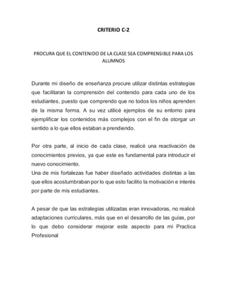 El documento contiene cinco criterios sobre las habilidades de un profesor para enseñar de manera efectiva. El Criterio 1 se enfoca en hacer claros los objetivos y procedimientos del aprendizaje para los estudiantes. El Criterio 2 trata sobre hacer comprensible el contenido de la clase para los estudiantes utilizando varias estrategias. El Criterio 3 promueve estimular a los estudiantes a ampliar su forma de pensar más allá de sólo aprender hechos. El Criterio 4 verifica la comprensión de los estudiantes