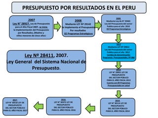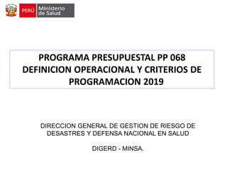 Este documento describe el Programa Presupuestal 068 de la Dirección General de Gestión de Riesgo de Desastres y Defensa Nacional en Salud (DIGERD) del Ministerio de Salud del Perú. Explica la evolución del presupuesto por resultados en el país desde 2007 y los nueve programas presupuestales en salud. También detalla los productos, actividades, objetivos e indicadores del PP 068 para 2019, el cual se enfoca en la estimación del riesgo, la preparación para emergencias, y la capacitación en gestión de riesgos.