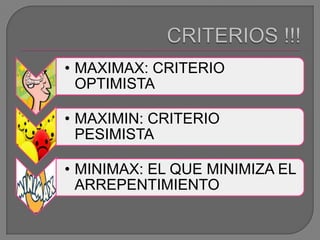 El documento explica tres criterios de decisión bajo incertidumbre: maximax, maximin y minimax. Maximax es el criterio optimista que busca maximizar el pago máximo posible. Maximin es el criterio pesimista que busca maximizar el pago mínimo posible. Minimax es el criterio que busca minimizar el arrepentimiento o pérdida de oportunidad posible al elegir una opción subóptima.