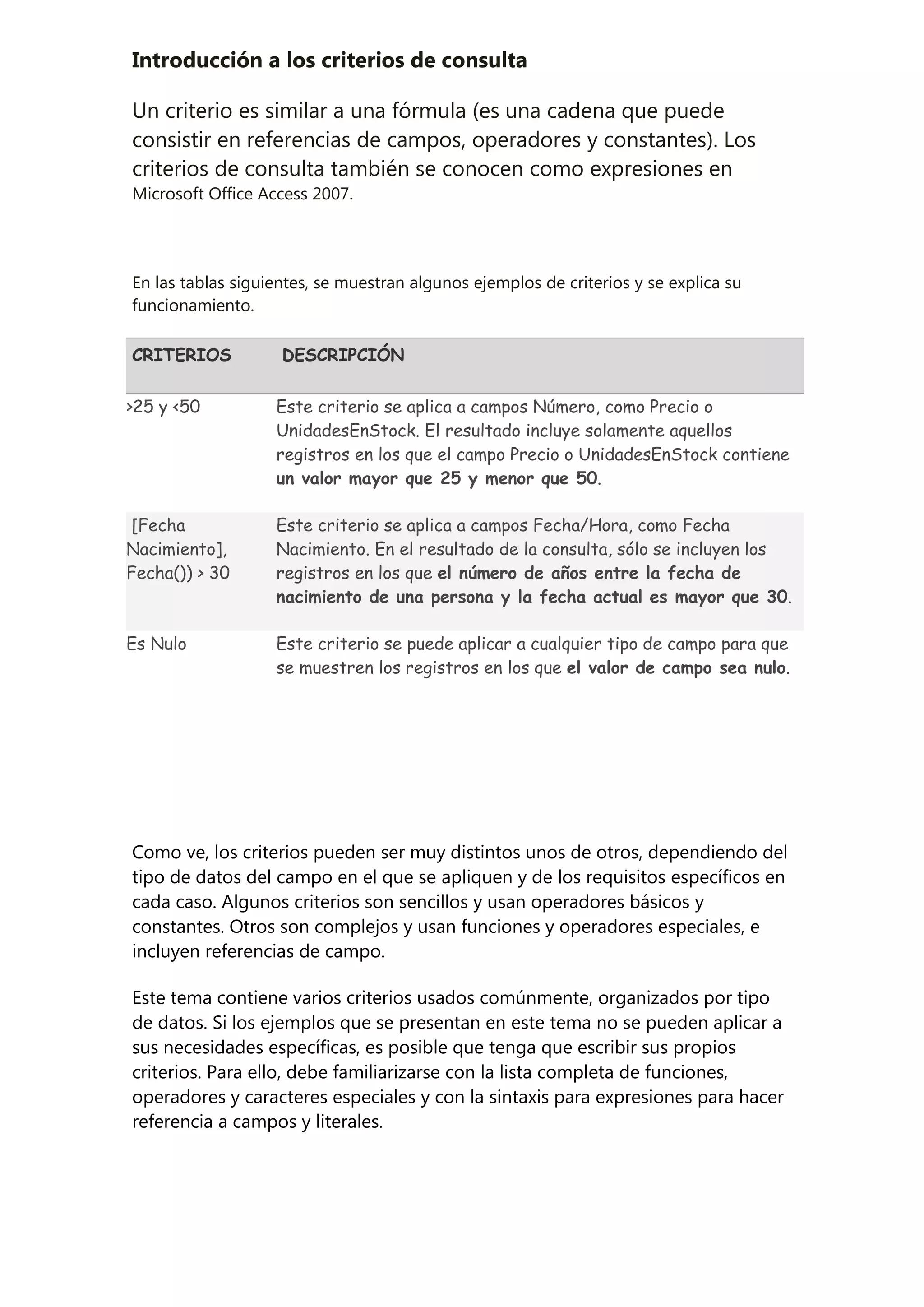 Un criterio es similar a una fórmula que puede contener referencias de campos, operadores y constantes y se usa para filtrar registros en una consulta. El documento proporciona ejemplos de criterios comunes para diferentes tipos de datos como números, fechas y campos nulos. Algunos criterios son simples mientras que otros son más complejos y usan funciones. Los criterios permiten seleccionar registros que cumplan condiciones específicas.