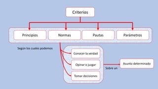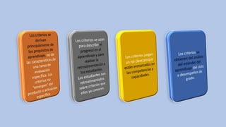 El documento habla sobre los criterios de evaluación. Explica que los criterios son el referente específico para emitir un juicio de valor sobre el nivel de desarrollo de las competencias de los estudiantes. Señala que los criterios deben describir las características o cualidades de lo que se va a evaluar, y que también deben ajustarse a la situación o problema a enfrentar. Además, los criterios se elaboran a partir de los estándares y desempeños de aprendizaje.