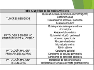 La clasificación IOTA (International Ovarian Tumor Analysis) proporciona criterios ecográficos para distinguir tumores ováricos benignos de malignos. Incluye cinco criterios de benignidad como lesión unilocular o vascularización ausente, y cinco de malignidad como contornos irregulares o abundante vascularización. Los tumores se clasifican como benignos si cumplen al menos un criterio de benignidad sin cumplir criterios de malignidad, y como malignos si cumplen al menos un criterio de malignidad sin cumplir criterios de benignidad