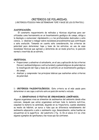 El documento presenta criterios físicos y paleontológicos para determinar la polaridad de estratos en geología, como una técnica novedosa y práctica. Se describen métodos para identificar la posición normal o invertida de los estratos usando ejemplos de ignofaunas, valvas de organismos y características sedimentológicas. También se analizan criterios estructurales aunque su uso es menos frecuente por su complejidad.