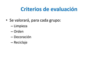 El documento describe los criterios de evaluación para el VII Concurso de Embellecimiento de Aulas del IES Cruz del Sur. Los criterios incluyen limpieza, orden, decoración y reciclaje. La limpieza se evaluará en base al estado de la pizarra, mesas y paredes. El orden se evaluará en base a la colocación de mesas y sillas y la ubicación de pertenencias. La decoración incluye carteles informativos y normas de aula. El reciclaje se evaluará en base a la ubicación de puntos de recogida y