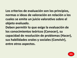 El documento presenta los criterios de evaluación que deben considerarse. Estos criterios deben permitir evaluar los conocimientos teóricos, habilidades prácticas y capacidades sociales de los estudiantes. Algunos criterios importantes incluyen dominio de contenidos, comprensión, análisis, habilidades de resolución de problemas, participación, trabajo en equipo y respeto hacia los demás. El documento también provee detalles sobre cómo establecer e implementar los criterios de evaluación de manera efectiva.