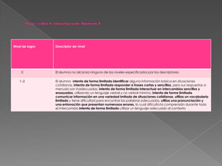 Este documento presenta los criterios y niveles de logro para evaluar las habilidades de comunicación oral, interpretación visual, comprensión escrita y redacción en un idioma extranjero. Los criterios incluyen comunicación oral, interpretación visual, comprensión escrita y redacción, cada uno con un máximo de 8 puntos. A continuación, se describen 8 niveles de logro desde 0 hasta 7-8 para cada criterio.