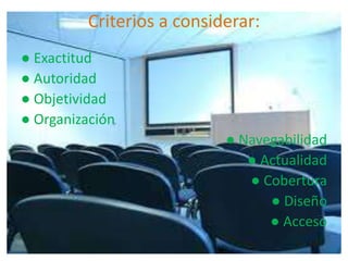 Este documento presenta una lista de criterios para evaluar la calidad y confiabilidad de la información encontrada en internet. Los criterios incluyen exactitud, autoridad, objetividad, organización, navegabilidad, actualidad, cobertura, diseño y acceso. Para cada criterio, se proporcionan preguntas para ayudar a analizar si la fuente cumple con ese estándar de calidad. El propósito es enseñar a los estudiantes a evaluar críticamente la información en línea y identificar fuentes confiables.
